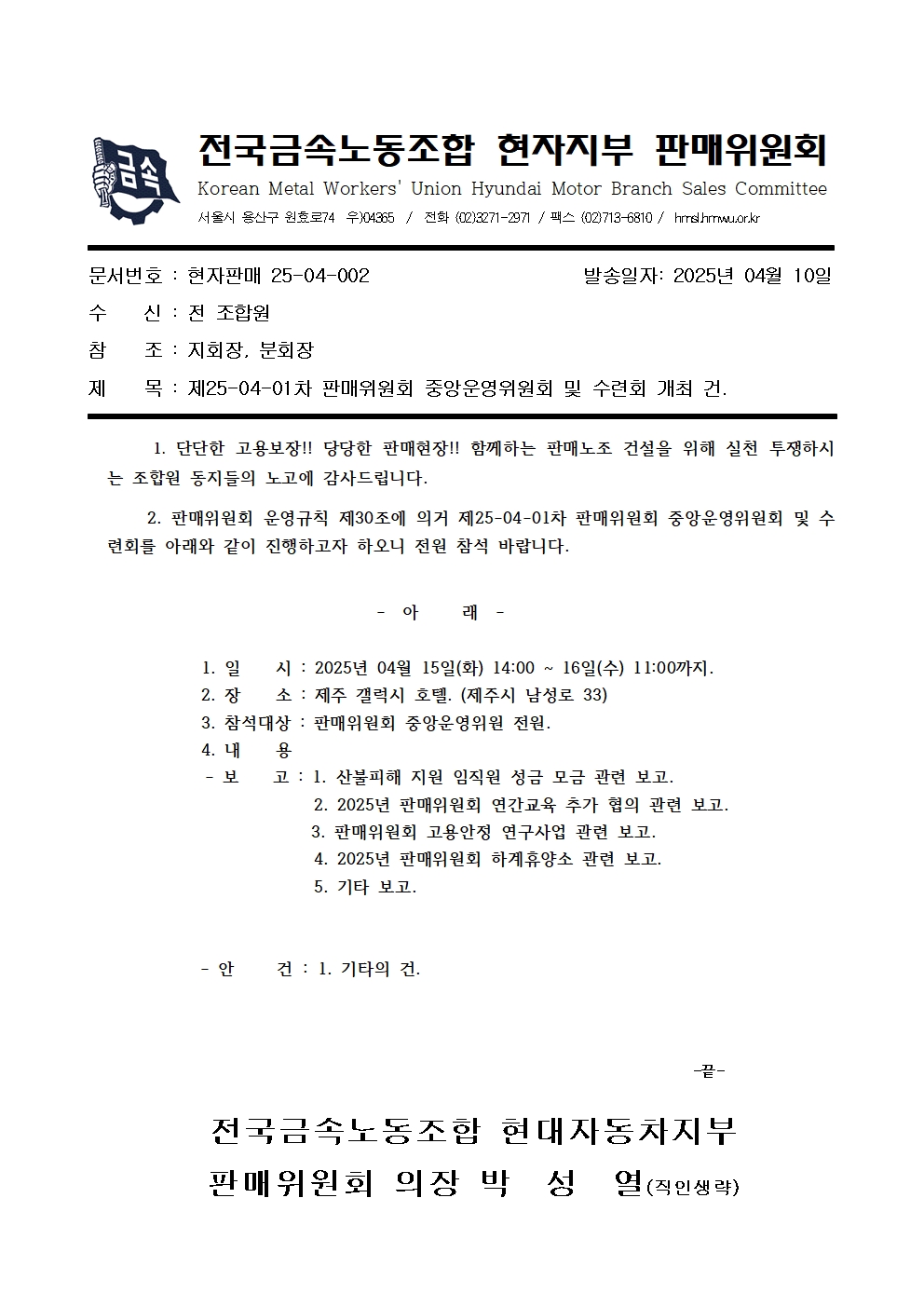 | Á¦25-04-01Â÷ ÆÇ¸ÅÀ§¿øÈ¸ Á߾ӿÀ§¿øÈ¸ ¹× ¼ö·Ãȸ °³ÃÖ °Ç | |||